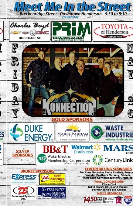 2016’s first of three free “Meet Me in the Street” concerts is scheduled for Friday, May 20 featuring “The Konnection Band”. A local favorite and one of the East Coast’s premiere party bands, The Konnection specializes in a variety of music including Top 40, Rock, Country, R & B, Beach and Oldies. The free concert will take place on Breckenridge Street in Downtown Henderson from 5:30 to 8:30 p.m. A variety of food vendors will be on hand and ID is required to purchase alcoholic beverages.