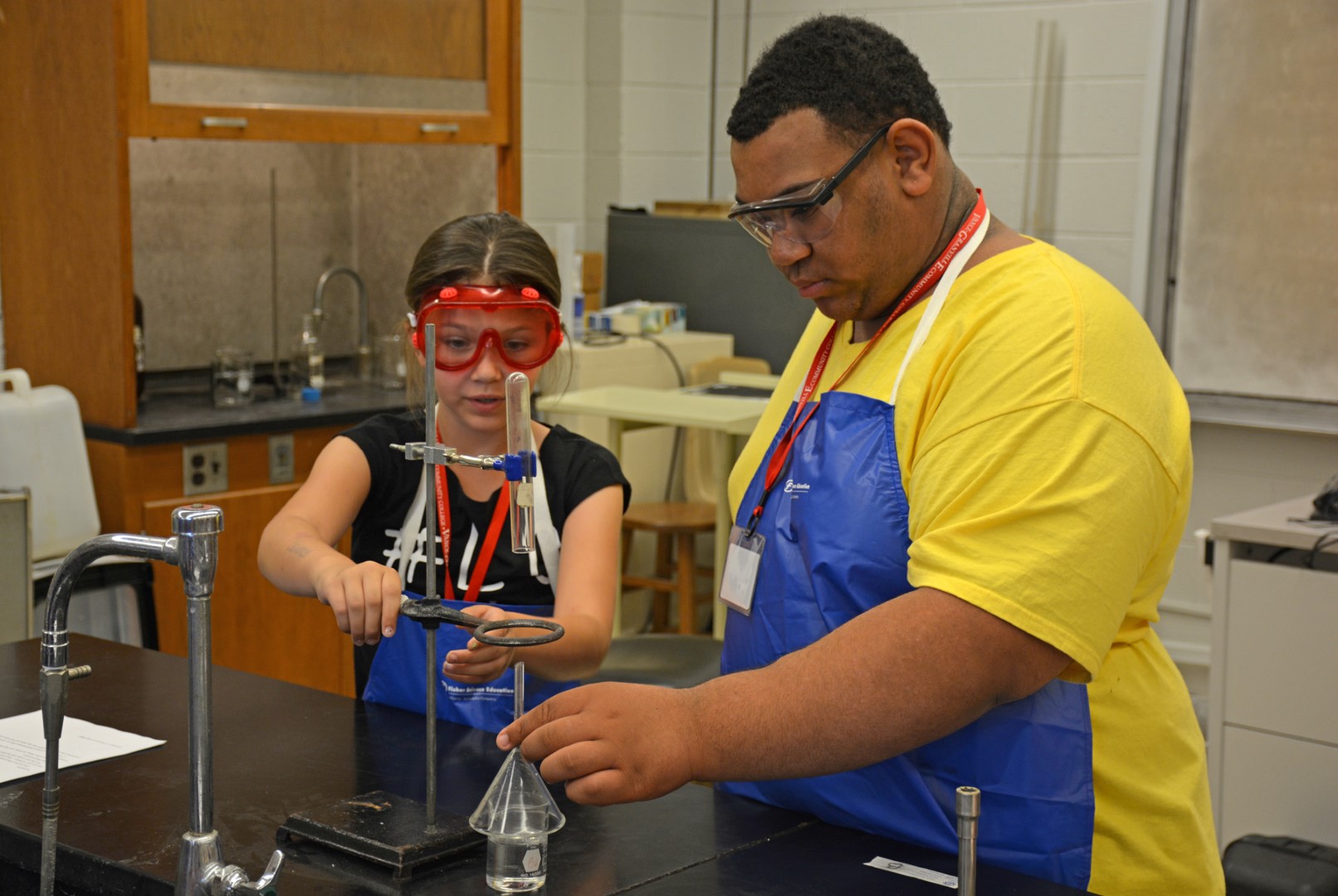 From left, Science Camp participants Savannah Jones of Creedmoor and Mar’kevious Cheatham of Oxford set up a chemistry experiment. (VGCC photo)