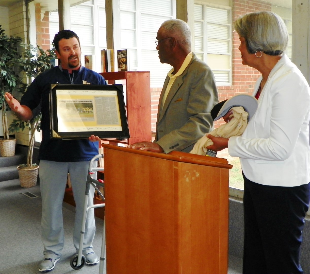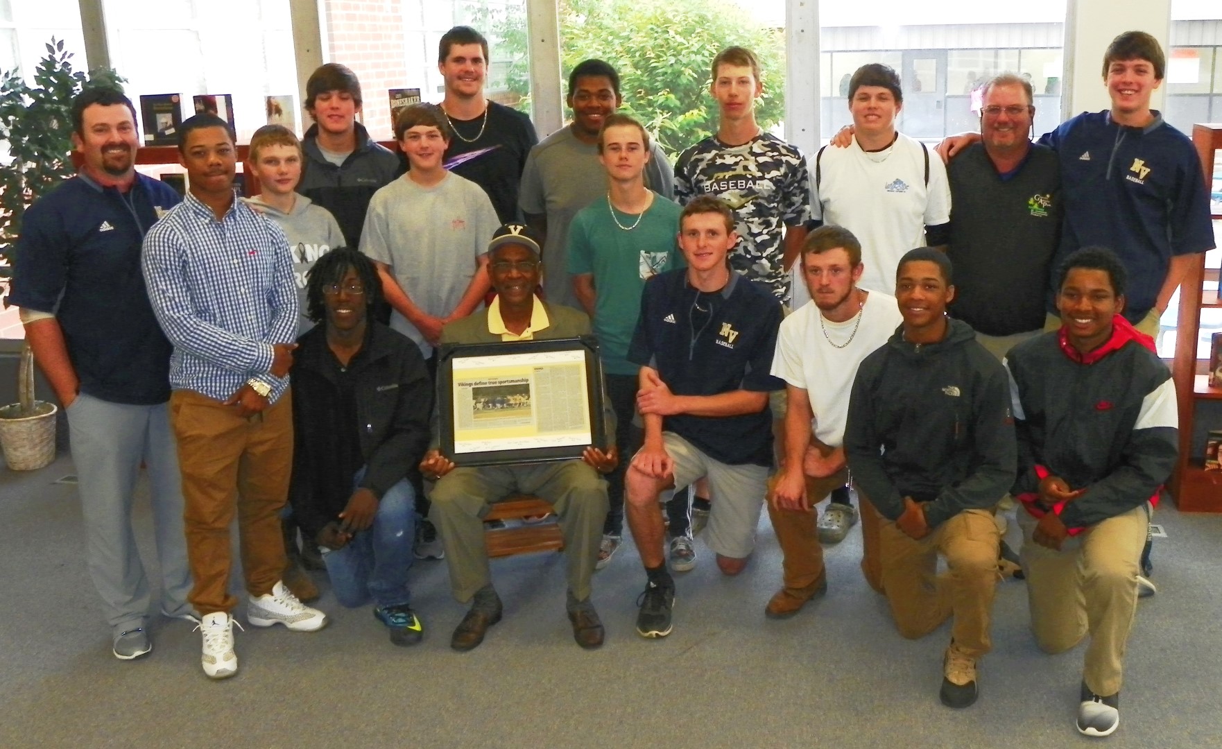 Nelson presented Anthony with a Vikings t-shirt and baseball cap, as well as a framed copy of the article that appeared in The Daily Dispatch, Henderson’s newspaper, about the teams’ fellowship that night after Anthony collapsed at the end of the game. Around the border of the framed article were the names of each of the Vikings’ players and their jersey numbers.