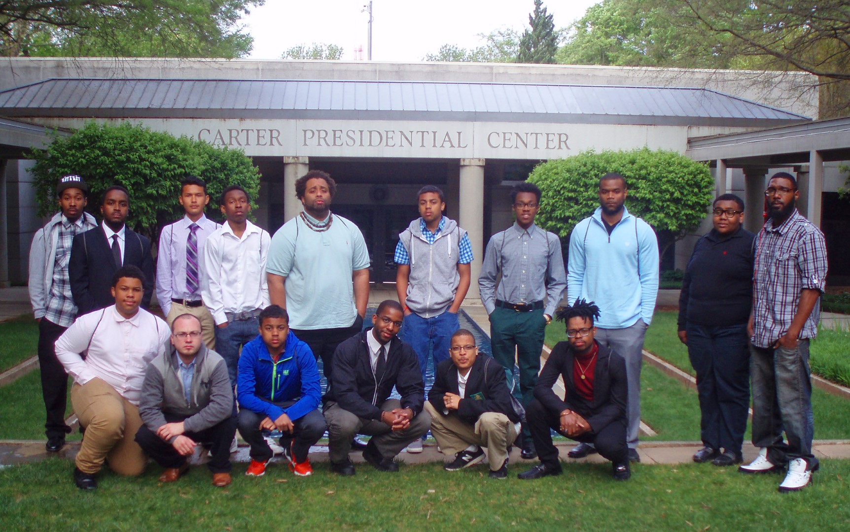 A group of VGCC students visited the Carter Center during their trip to Atlanta. They included, kneeling in front, from left, Travis Williams, Matthew Jaurique, Cody Boylorn, Benjamin Marshall, Bradley Gooch and Dajuan Harrison; and standing, from left, Mycal Elam, Christopher Blue, Heriberto Leos, Joshua Horton, Johnathan Williamson, Tyler Boylorn, Miles Brown, Mikal Williams, Tyrese Perry and Quincy Hart. (VGCC photo)
