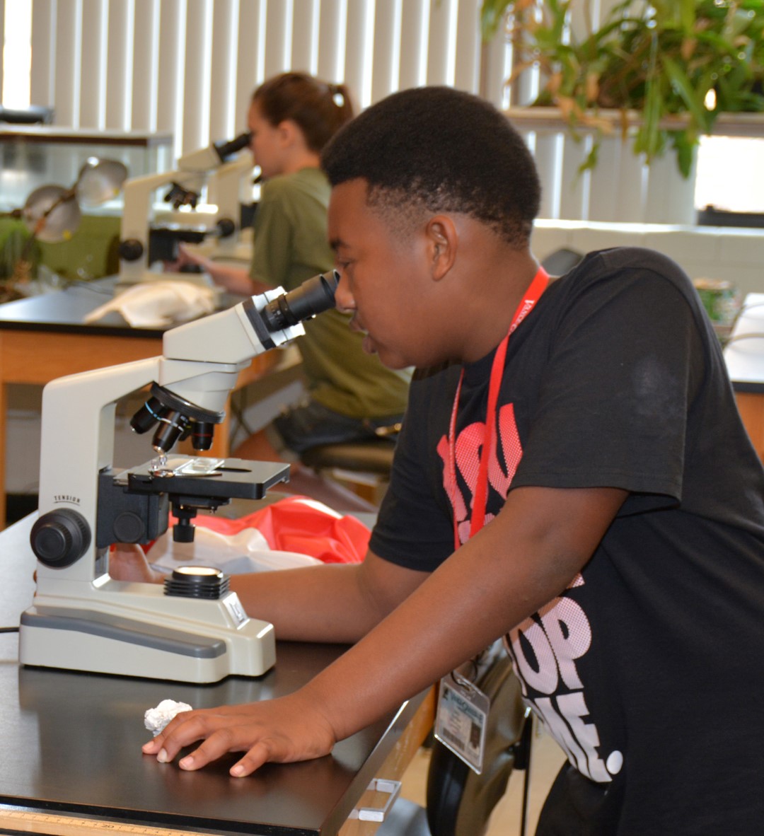 Science Camp participant Zelton Thompson of Henderson views a protozoan (a type of microorganism) under a microscope. (VGCC photo)