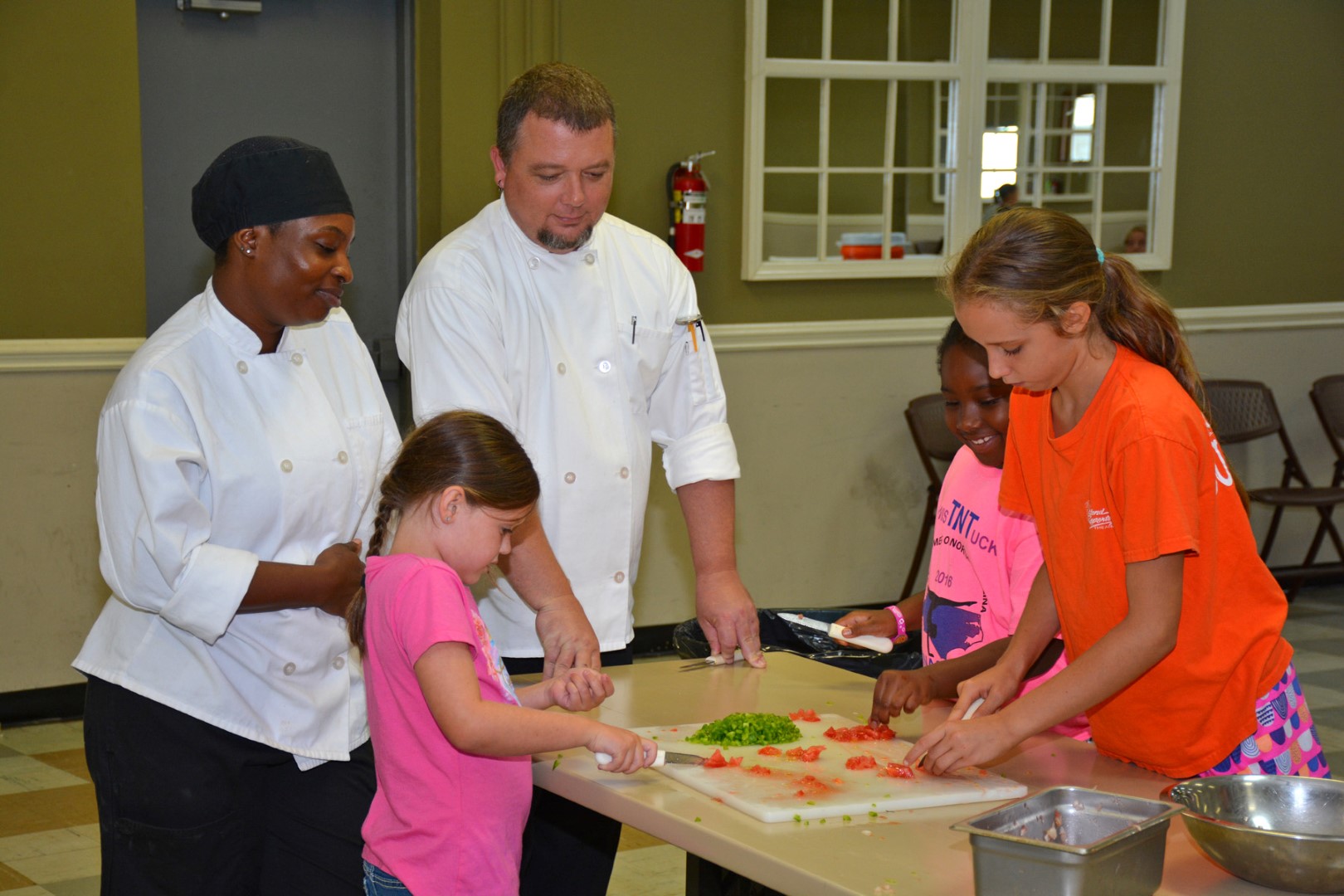From left, VGCC Culinary Arts students Hayya Wright of Henderson and Randy Bullock of Stem look on as campers chop vegetables that will go in a pizza. (VGCC photo)