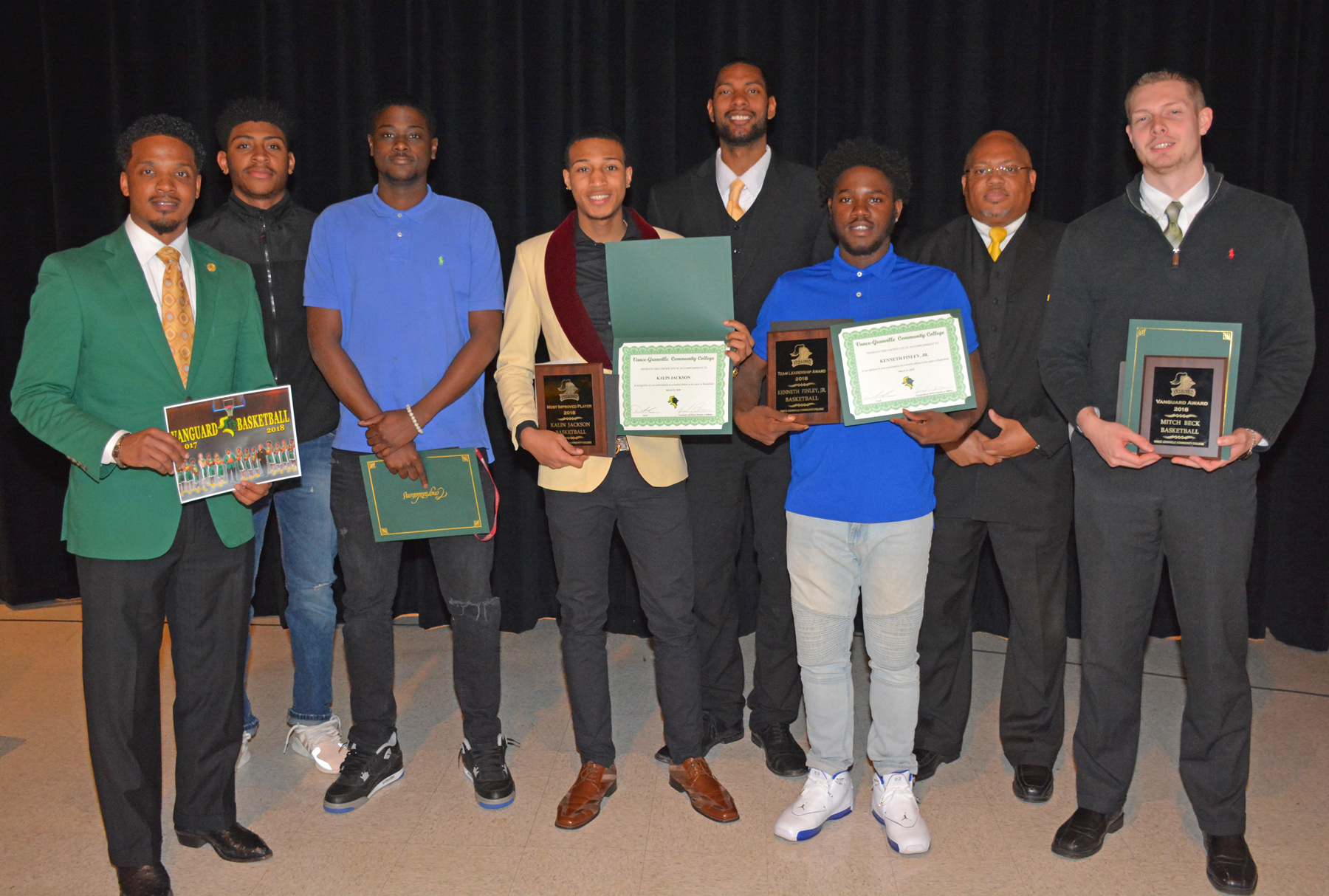 From left, VGCC men’s basketball Head Coach DeMarcus Oliver, student-athletes Calvin Malik Manley, Cora Mbaye, Kalin Jackson (Most Improved), Assistant Coach Eladio Espinosa, student-athlete KJ Finley (Team Leadership Award), Assistant Coach Anthony McCrimmon and student-athlete Mitch Beck (Vanguard Award). (VGCC photo)